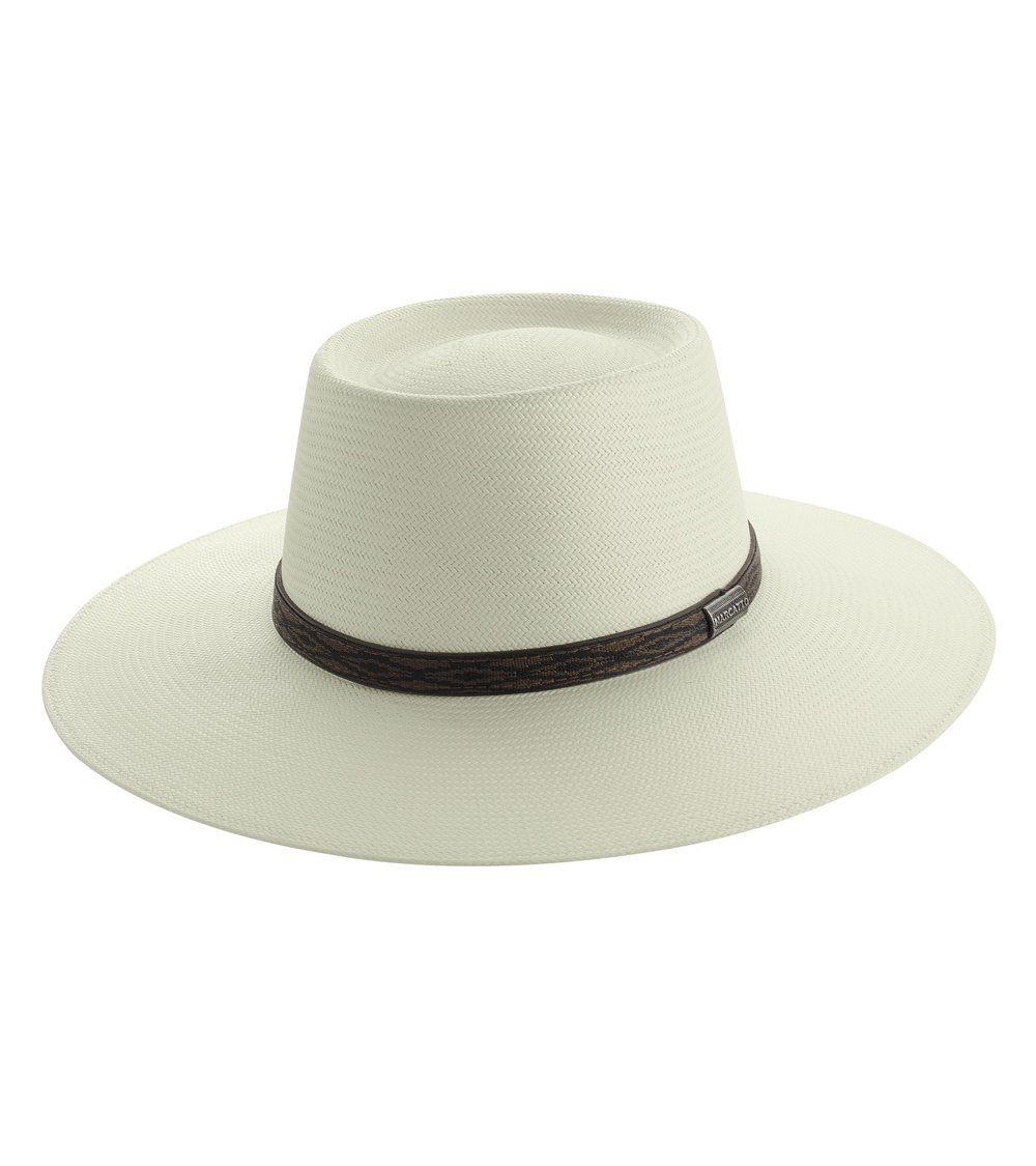 hapéu Marcatto em Palha Shantung 20X, forma Gaúcha Copa Redonda: • Carneira Elástica • Banda Sintética com aplicação de metal Marcatto • Copa - Medida Interna: 9,5cm / Medida Externa: 10,5cm • Aba 9cm.